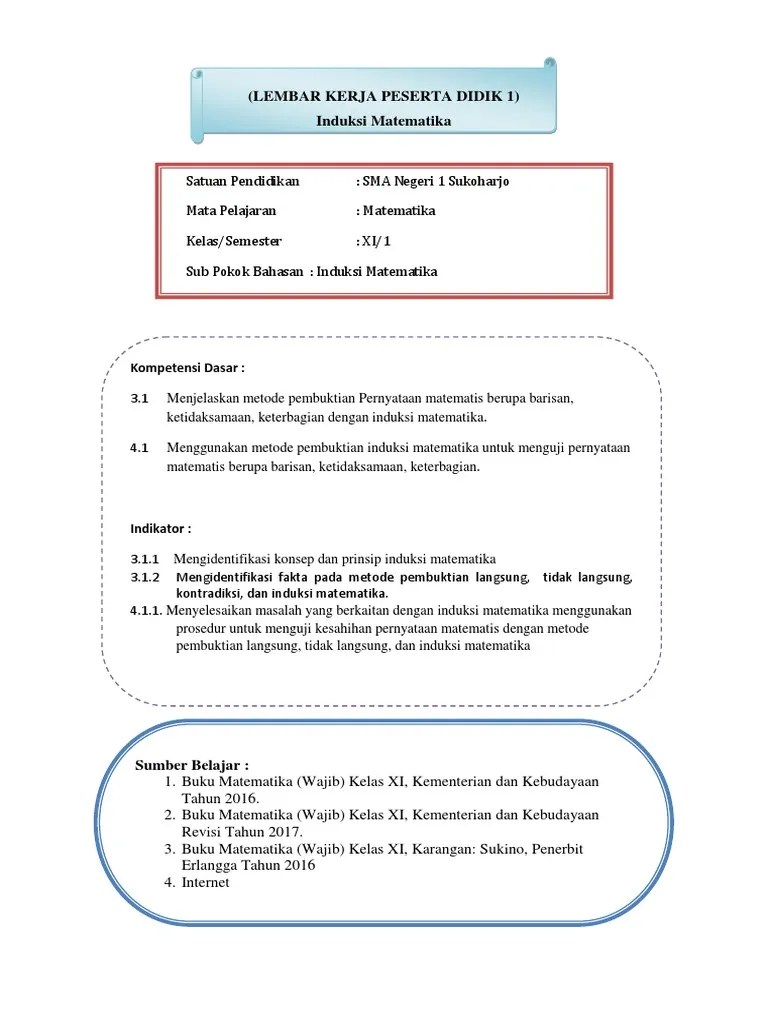 kunci jawaban matematika wajib kelas 11 kurikulum 2013 sukino guru galeri. 331098499 untuk download kunci jawaban buku pr sma intan. Pada pembahasan ini kita akan berlatih untuk membuktikan suatu pernyataan matematis dengan menggunakan induksi matematika. Prinsip induksi matematika untuk setiap bilangan bulat positif n, misalkan p(n) adalah pernyataan yang bergantung pada n. P(1) benar.langkah induksi (induction step):